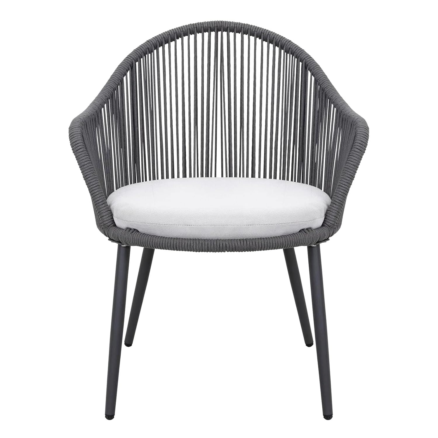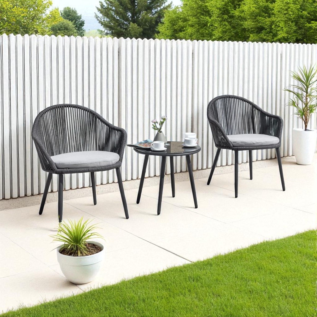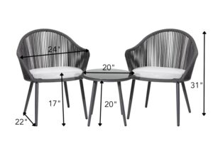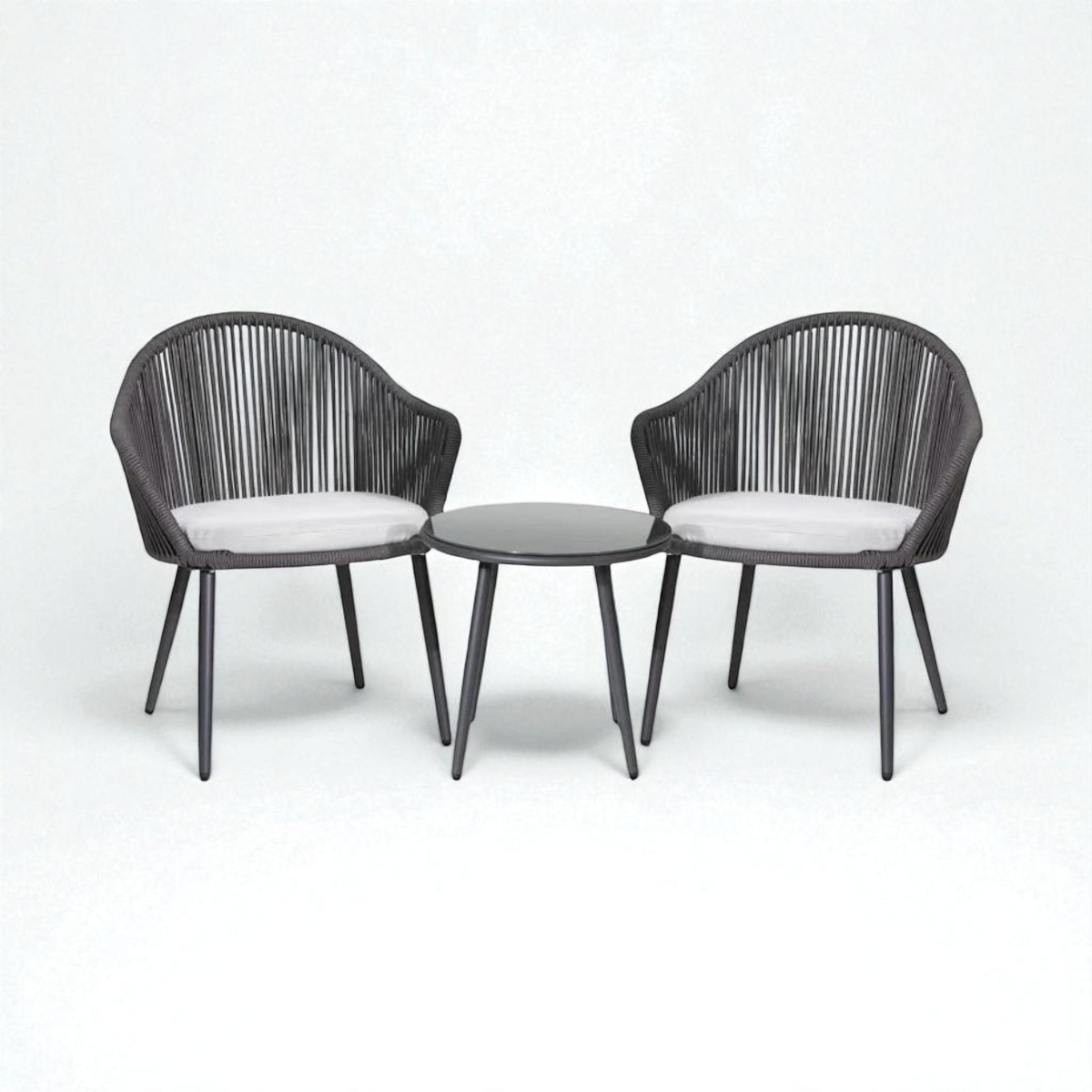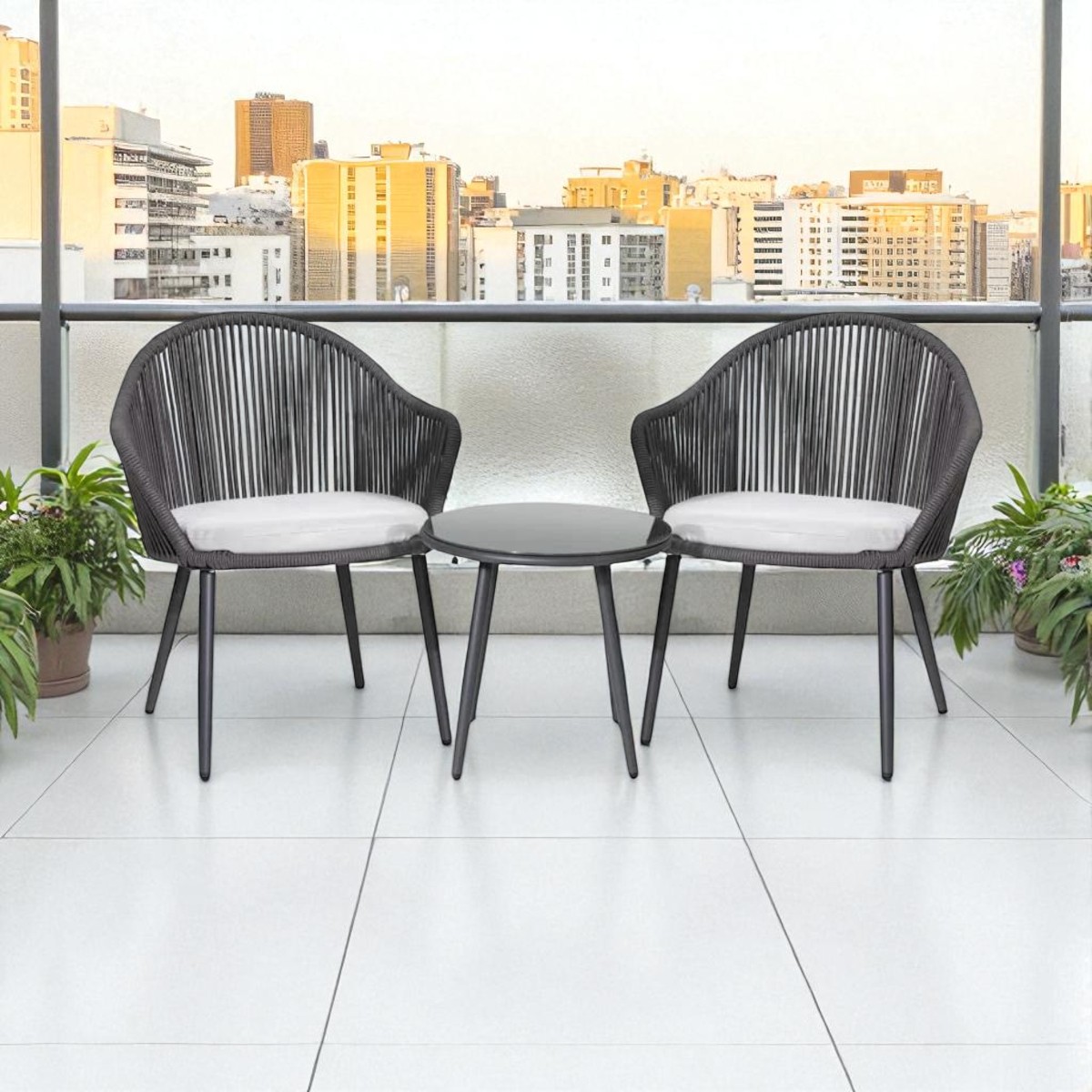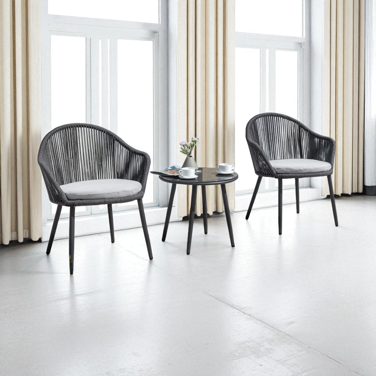 Each chair features a sturdy powder-coated metal frame with handwoven all-weather rope, offering a breathable and supportive seating experience. The soft, removable cushions ensure added comfort, while the compact glass table is perfect for your morning coffee, reading, or relaxing chats outdoors.