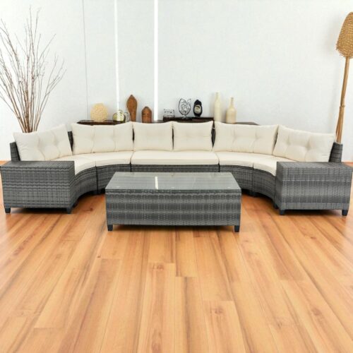 • Black Stainless Steel PE Rattan Outdoor Dining Sofa Set with Glass Table – 8-Piece Patio Furniture